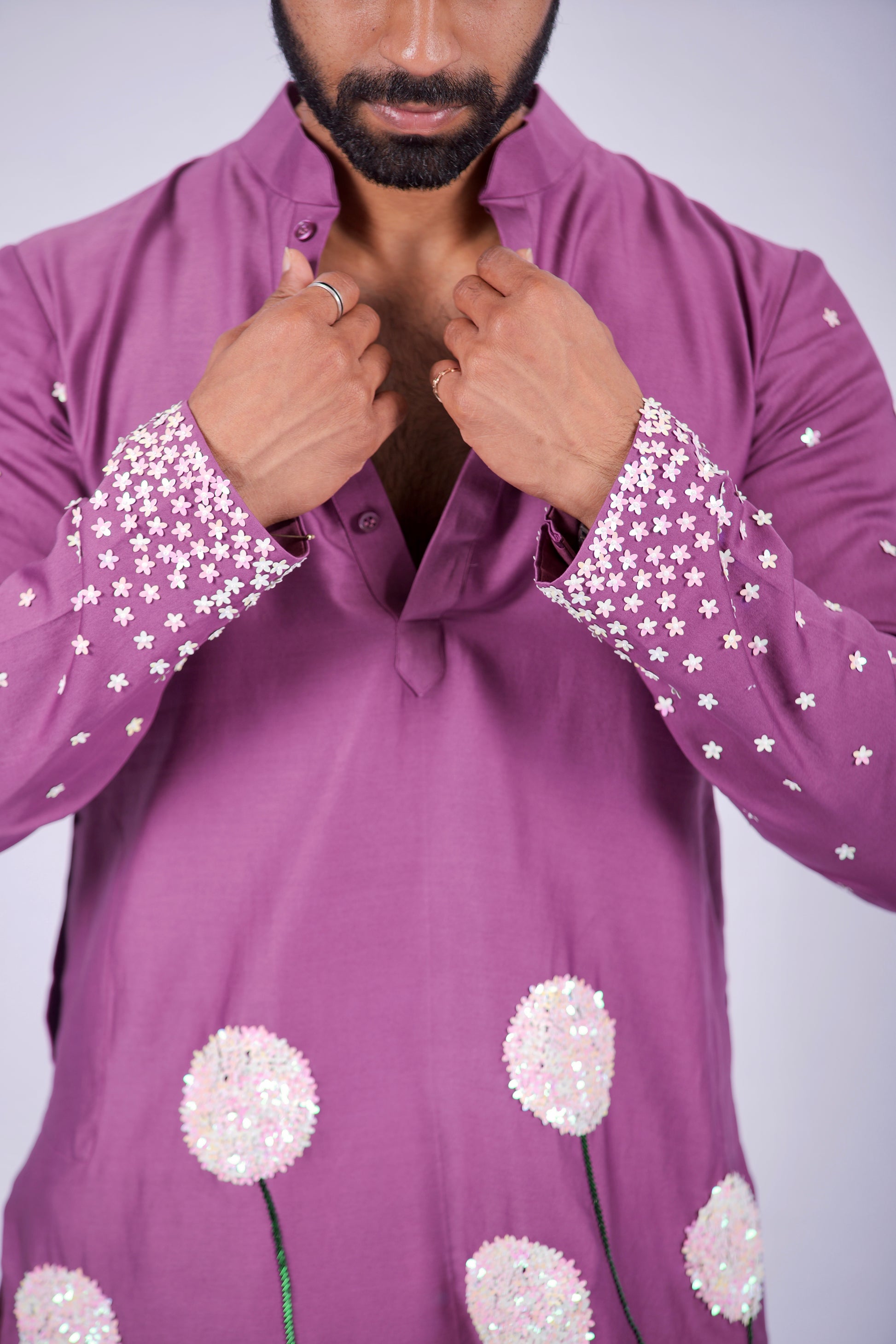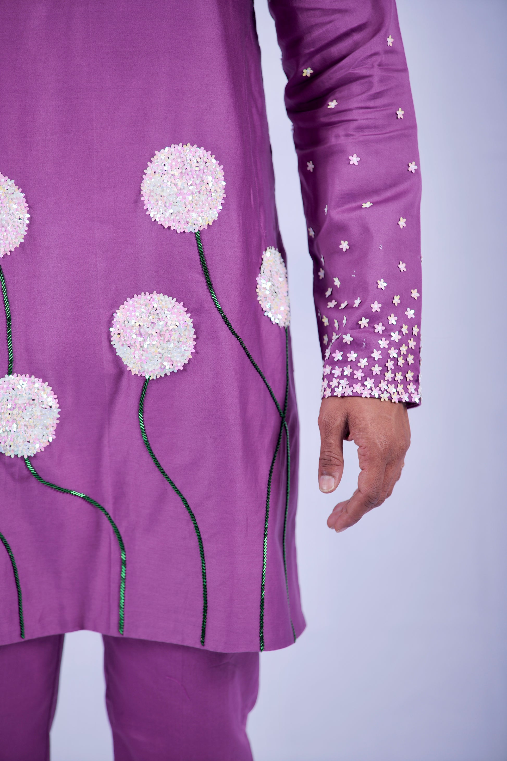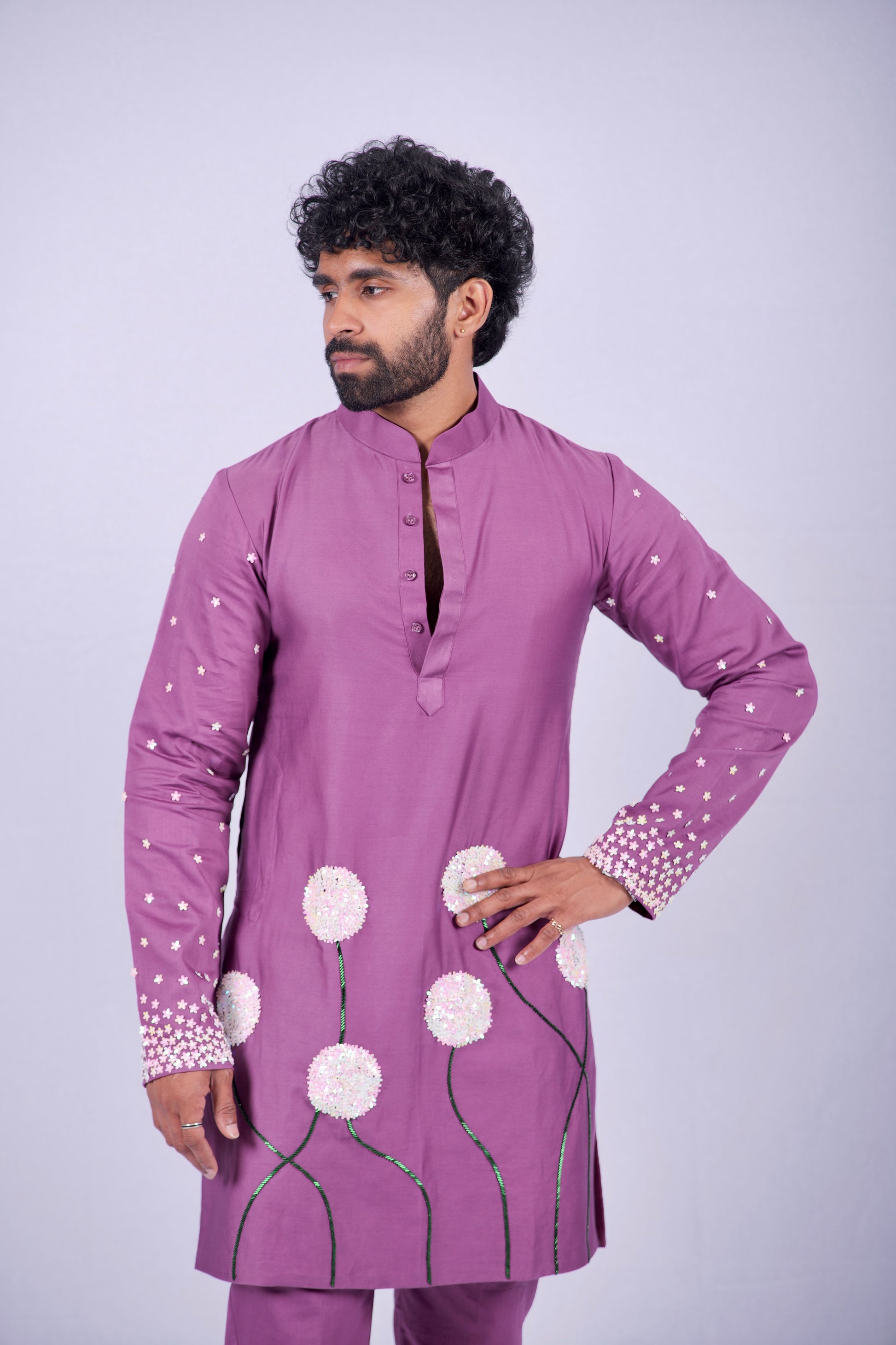 Born from a canvas of premium Cotton, this kurta set is a celebration of slow, intentional craft. Every detail is a tribute to the human hand—from the rich mauve hue to the whimsical dandelion motifs that seem to sway with your movement. It is designed for the modern man who values a garment with a soul.