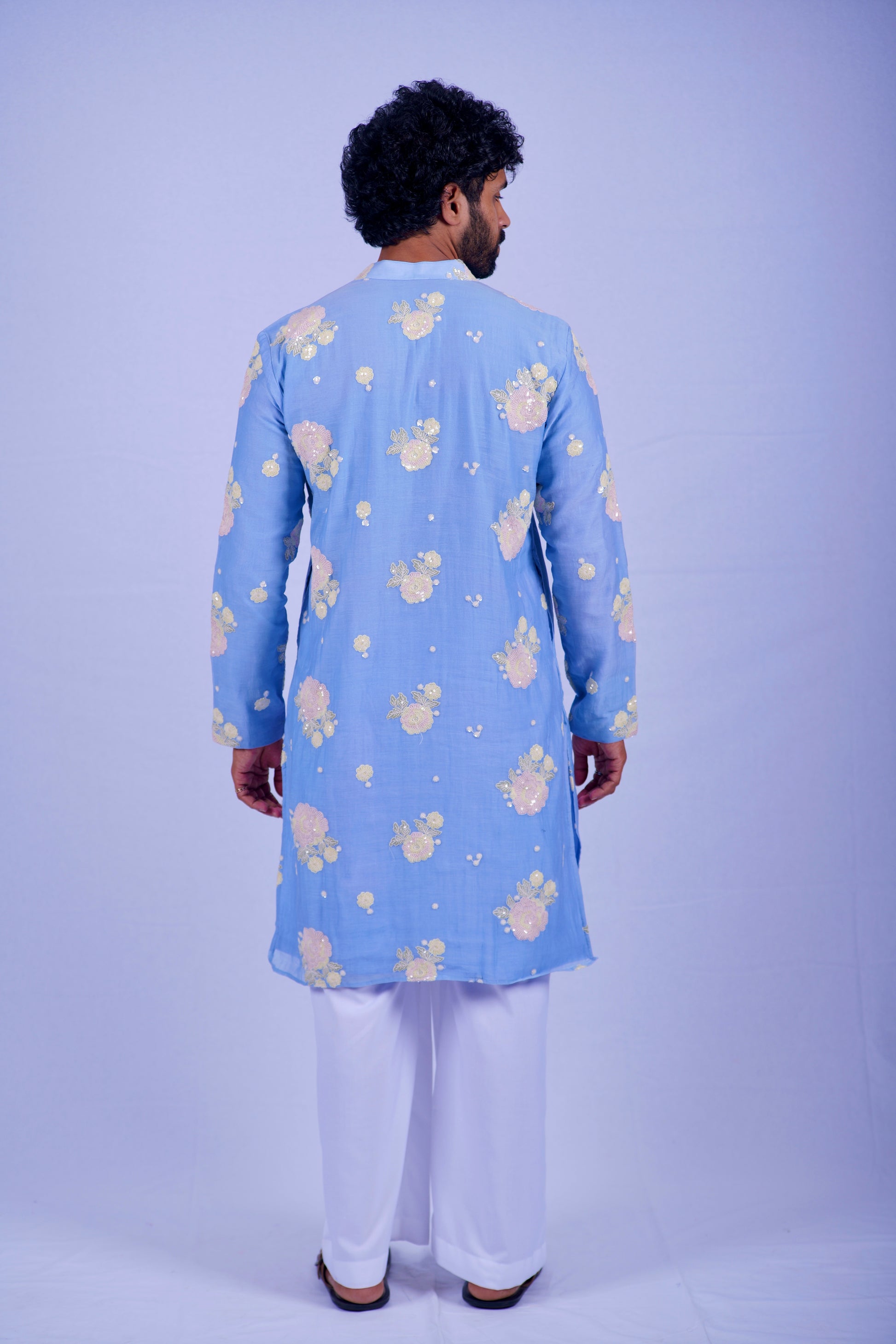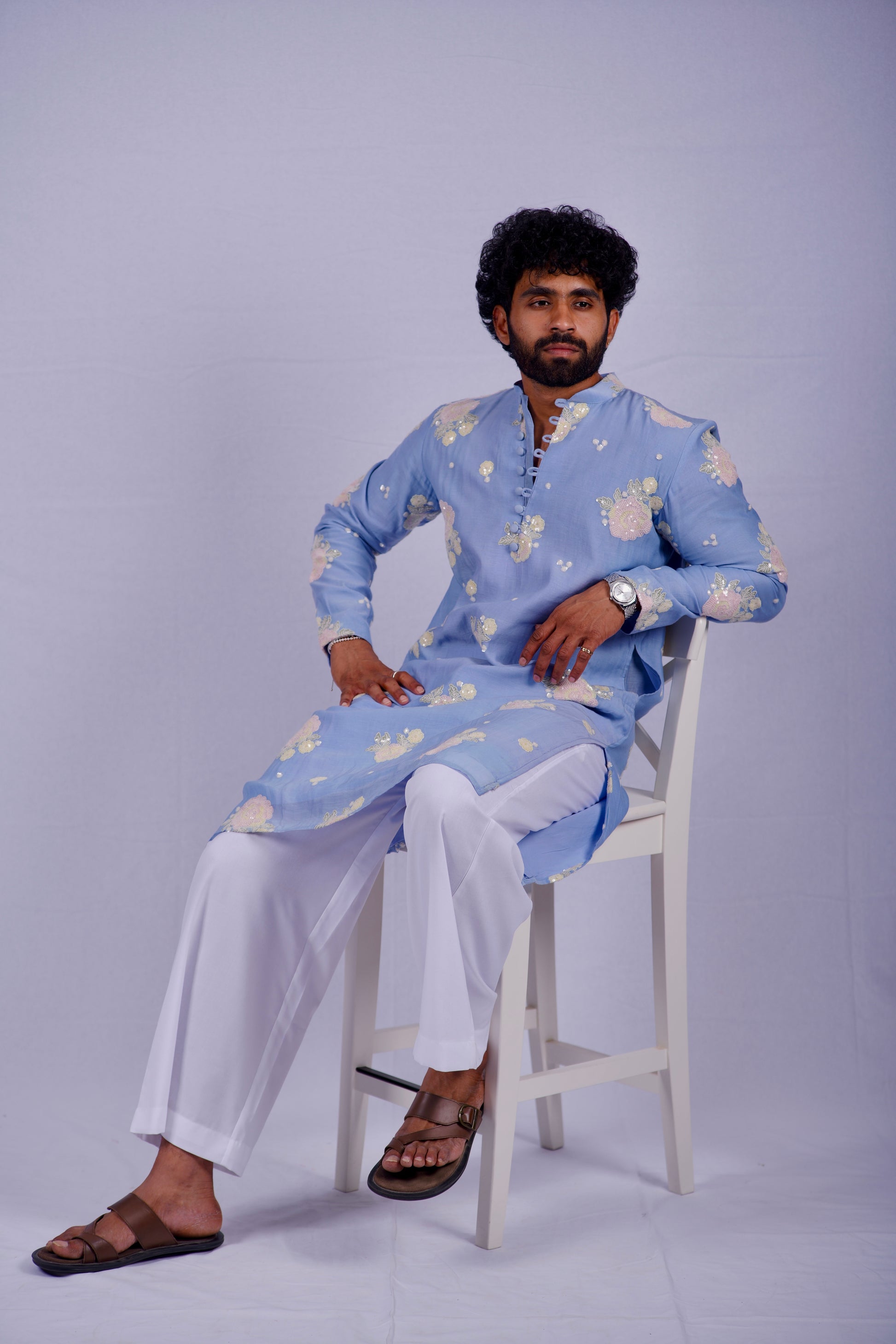 The Azure Meadow Kurta is a versatile masterpiece. For a modern, high-fashion look, pair it with the white wide-leg trousers and leather sandals as shown. For a more formal traditional setting, it pairs beautifully with slim-fit cream churidars and a silver watch to complement the sequin work.