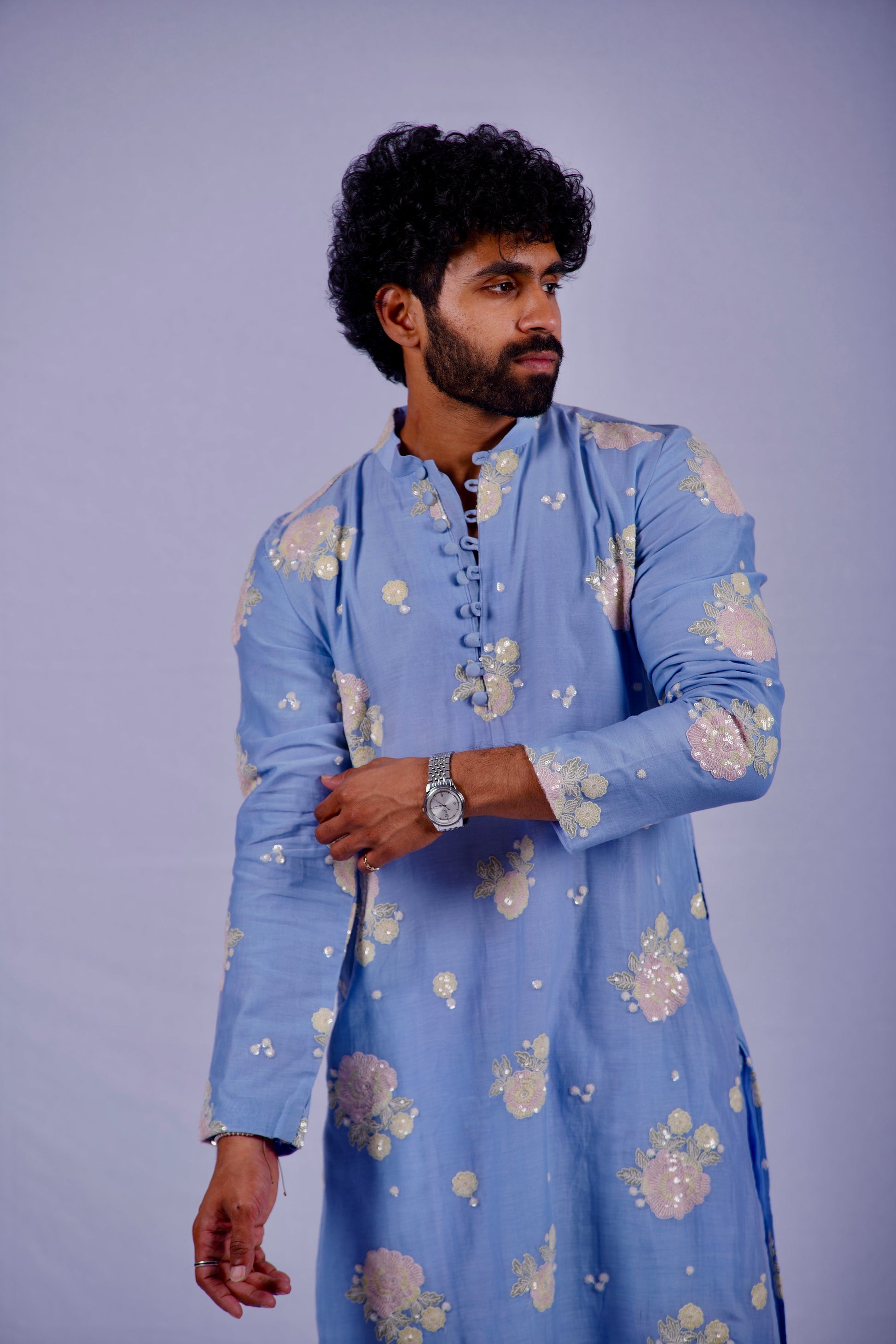 Woven from a premium blend of Linen and Cotton, this kurta captures the essence of a clear spring sky. It is a no piece defined by "quiet luxury"—where the rugged, breathable texture of linen meets the refined artistry of hand-embroidery. Adorned with blooming floral motifs that catch the light with every movement, this kurta is crafted for the man who commands attention through subtlety and grace