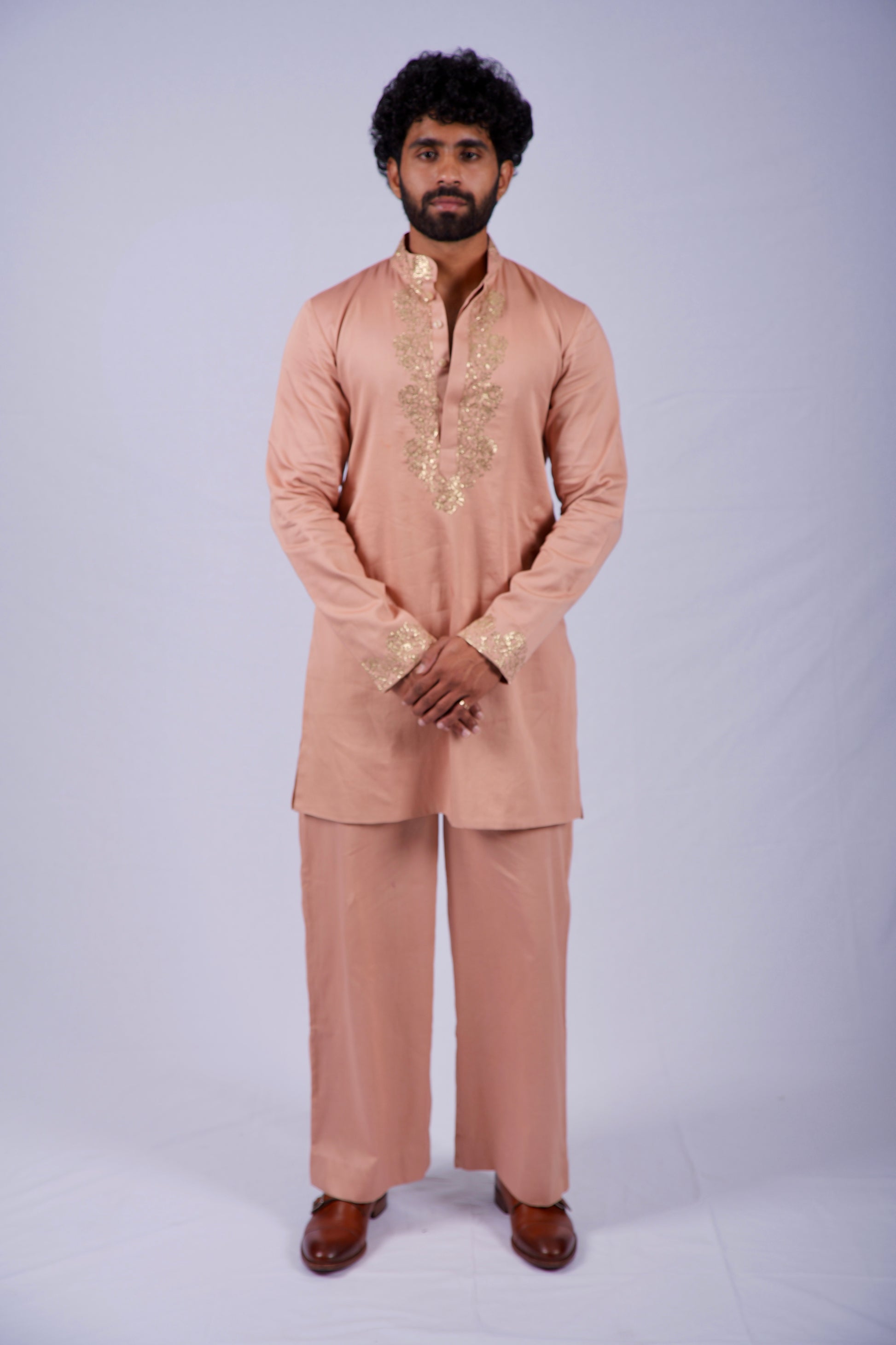 Infused with the warmth of a desert sunset, the Gilded Rosette is a testament to the art of subtle luxury. Crafted from premium Cotton, this peach-toned ensemble serves as a soft, sophisticated canvas for extraordinary craftsmanship. The neckline and cuffs are adorned with intricate, hand-rendered golden embroidery, weaving a story of heritage and modern refinement. It is the perfect choice for the man who seeks elegance that whispers rather than shouts.