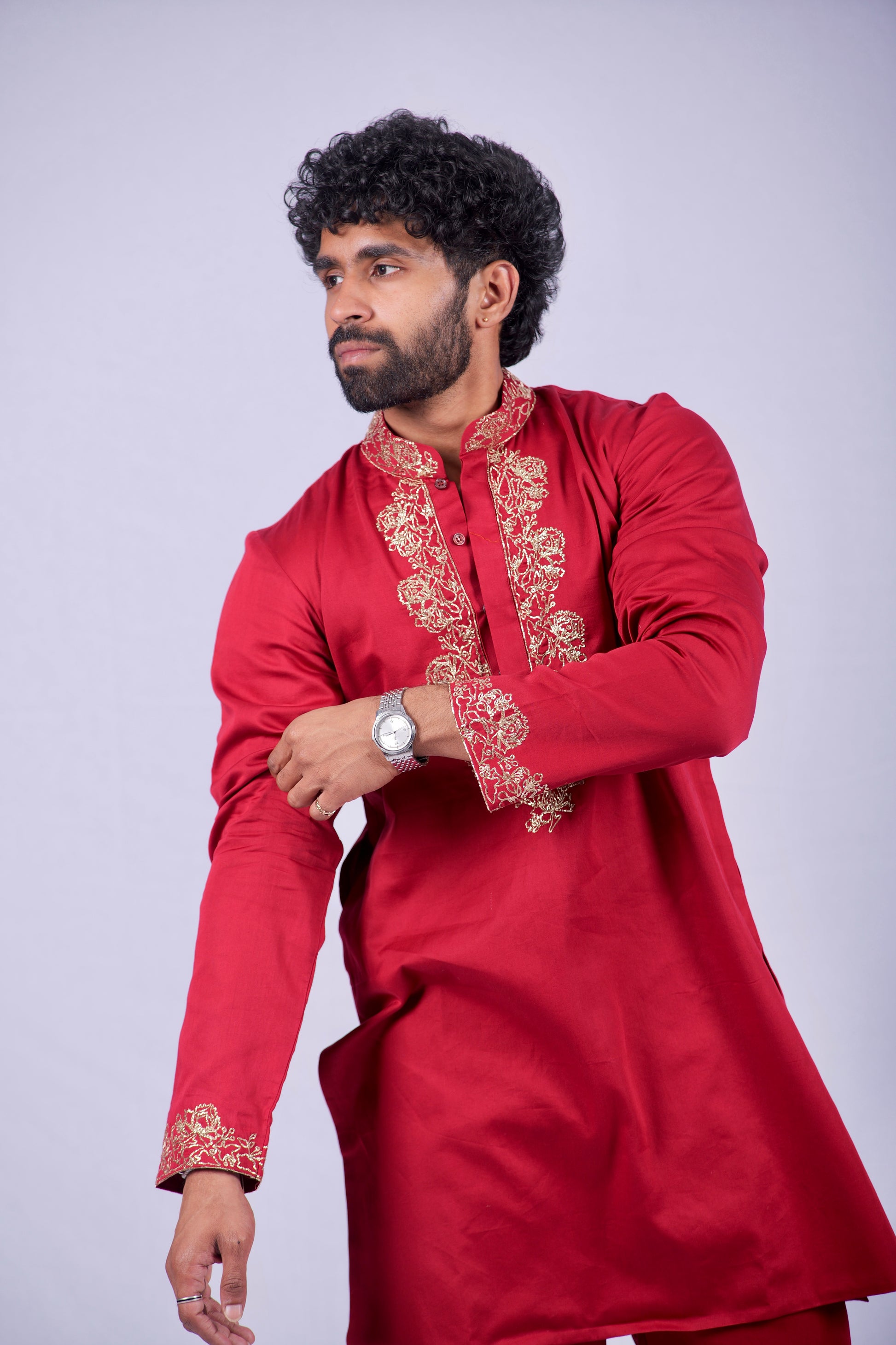 The red Gilded Rosette is a versatile masterpiece, ideal for daytime weddings, engagement ceremonies, or festive brunch celebrations. Pair with tan leather loafers or traditional juttis to complete this distinguished look.