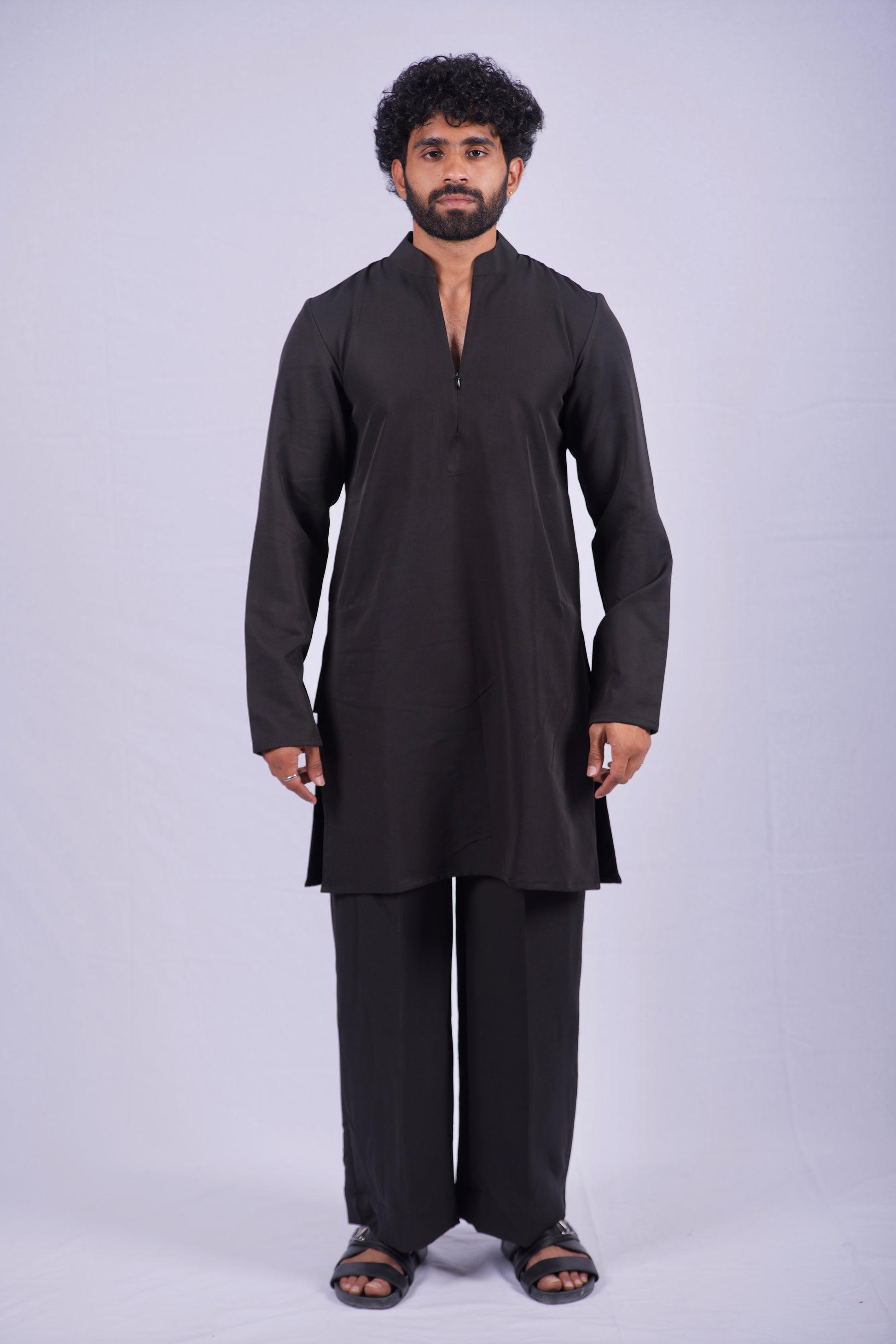 Command the room with the silent authority of our Midnight Minimalist Kurta & Pant Set. Crafted from ultra-premium Banana Crepe, this set is a masterclass in modern ethnic wear. The deep, obsidian black finish combined with the fluid, liquid-like drape of the fabric creates a silhouette that is both powerful and refined. This is the ultimate ensemble for the man who favors a dark, sharp, and sophisticated aesthetic.